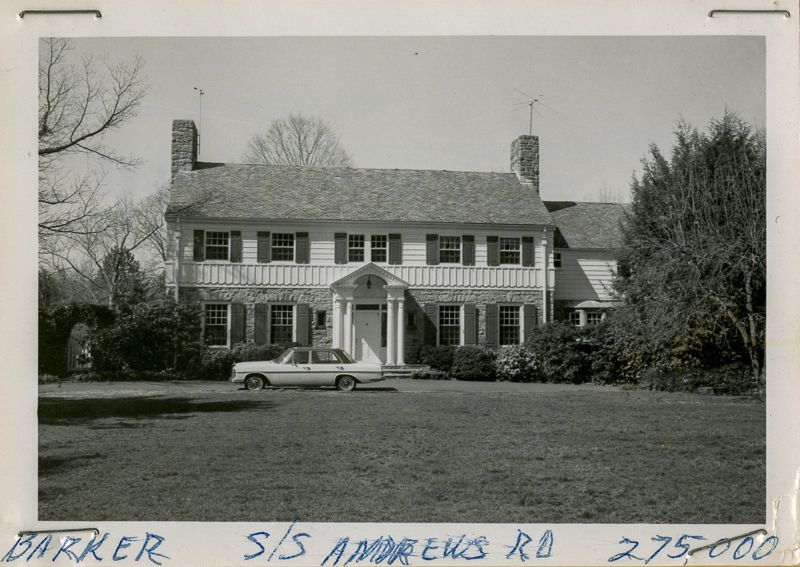 Colonial style house built in 1938 with a small portico, stone and clapboard walls, and a car parked on its driveway viewed from its lawn.Collection