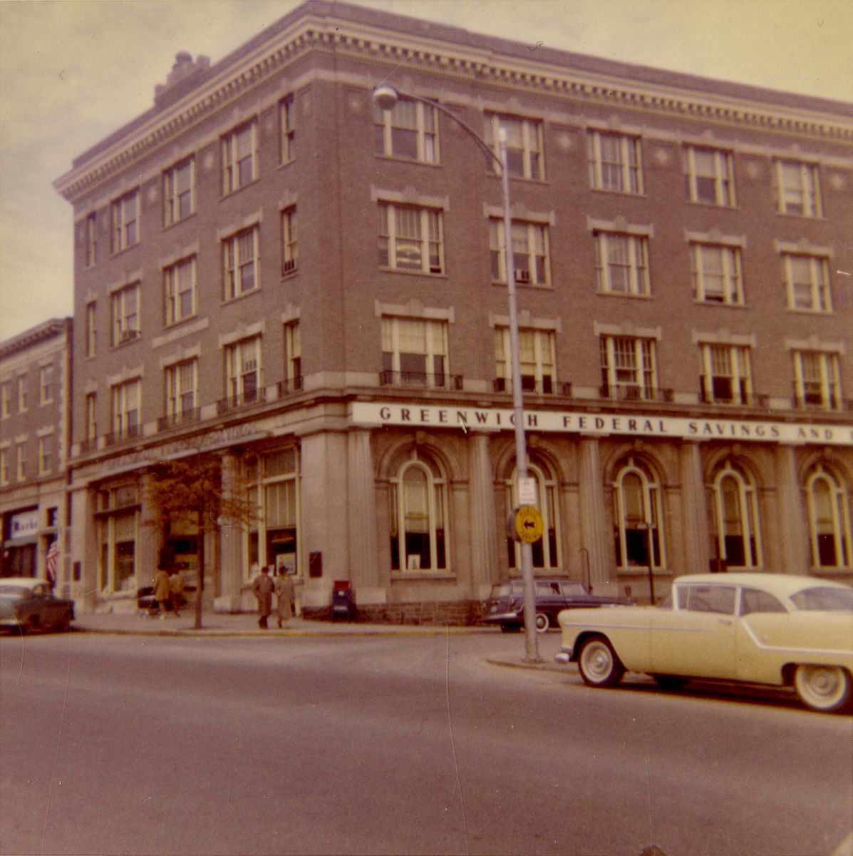 View from across the street of the Smith Building in March 1961 when it housed the Greenwich Federal Savings and Loan Association.Collection