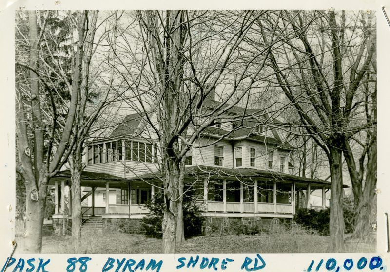 Colonial style house built in the 1910's with a wraparound porch viewed from its lawn.
