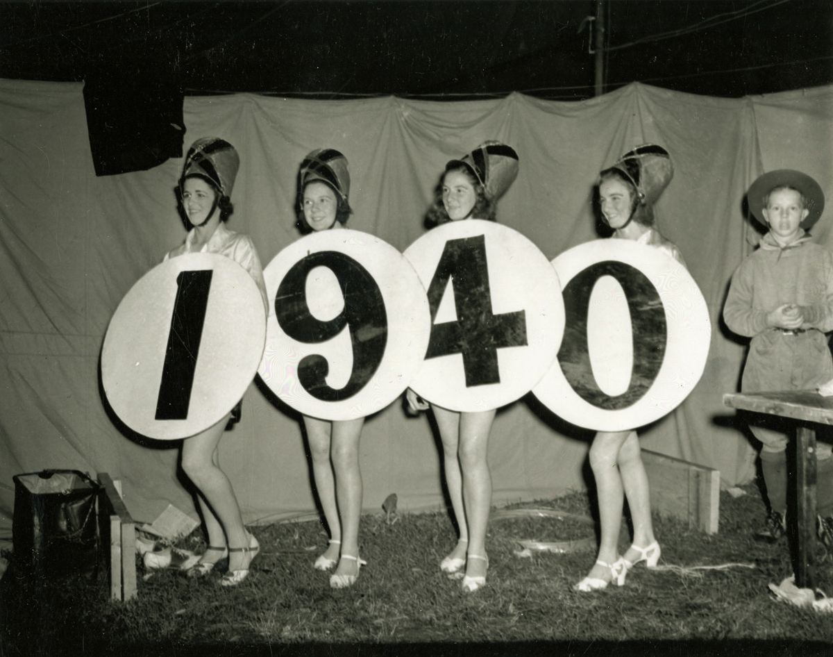 Four young women posing in sandwich-boards with numbers reading '1940' on them.