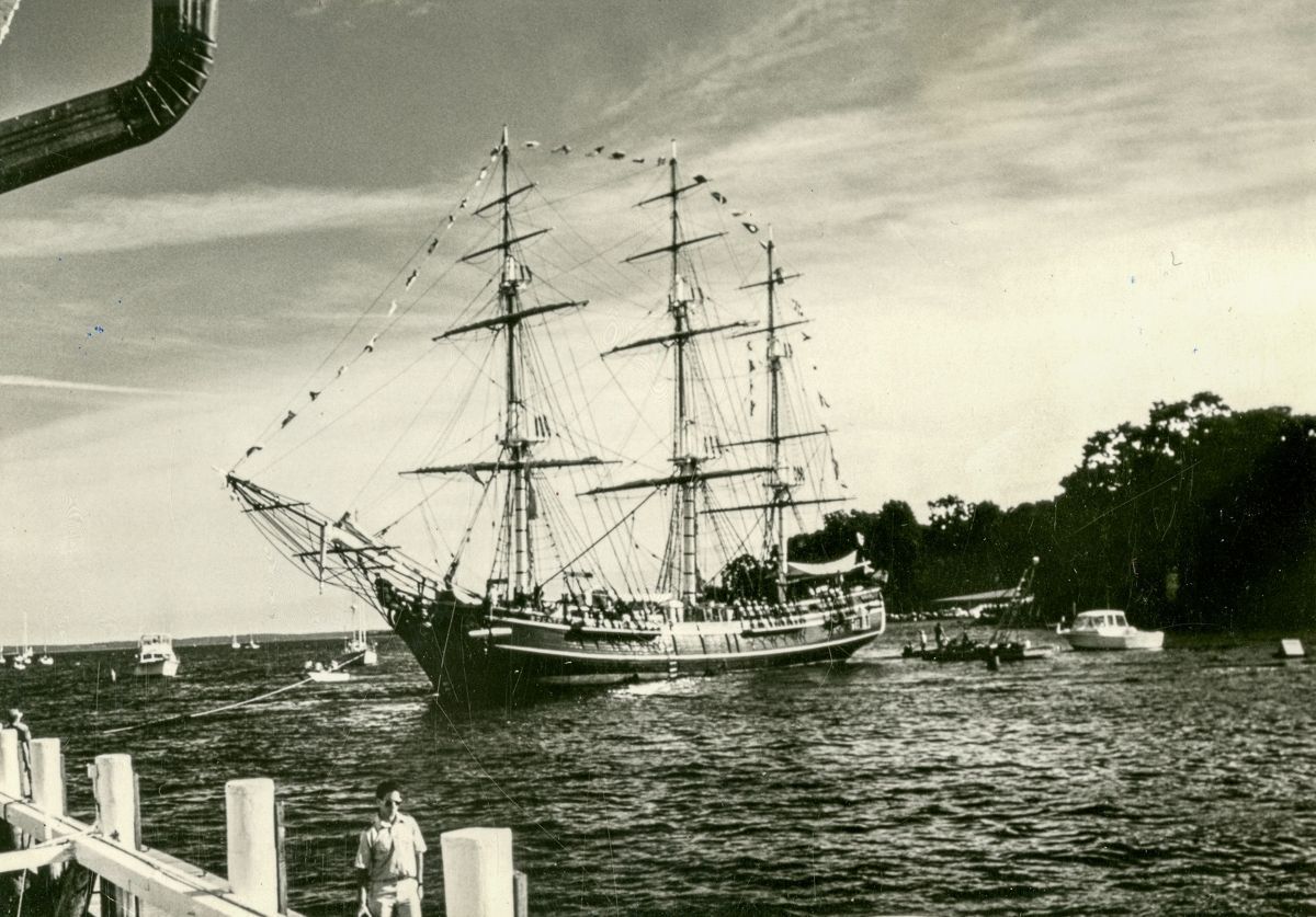 MGM's "Bounty," built in 1965 for the movie "Mutiny on the Bounty," visiting the Indian Harbor Yacht Club on July 3rd, 1986 prior to its presence by the Statue of Liberty for the July 4th celebrations that year.Collection