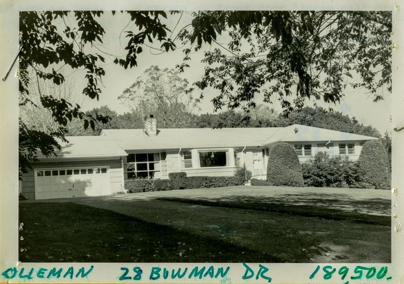 Ranch house built in the 1950's with a garage viewed from the lawn.