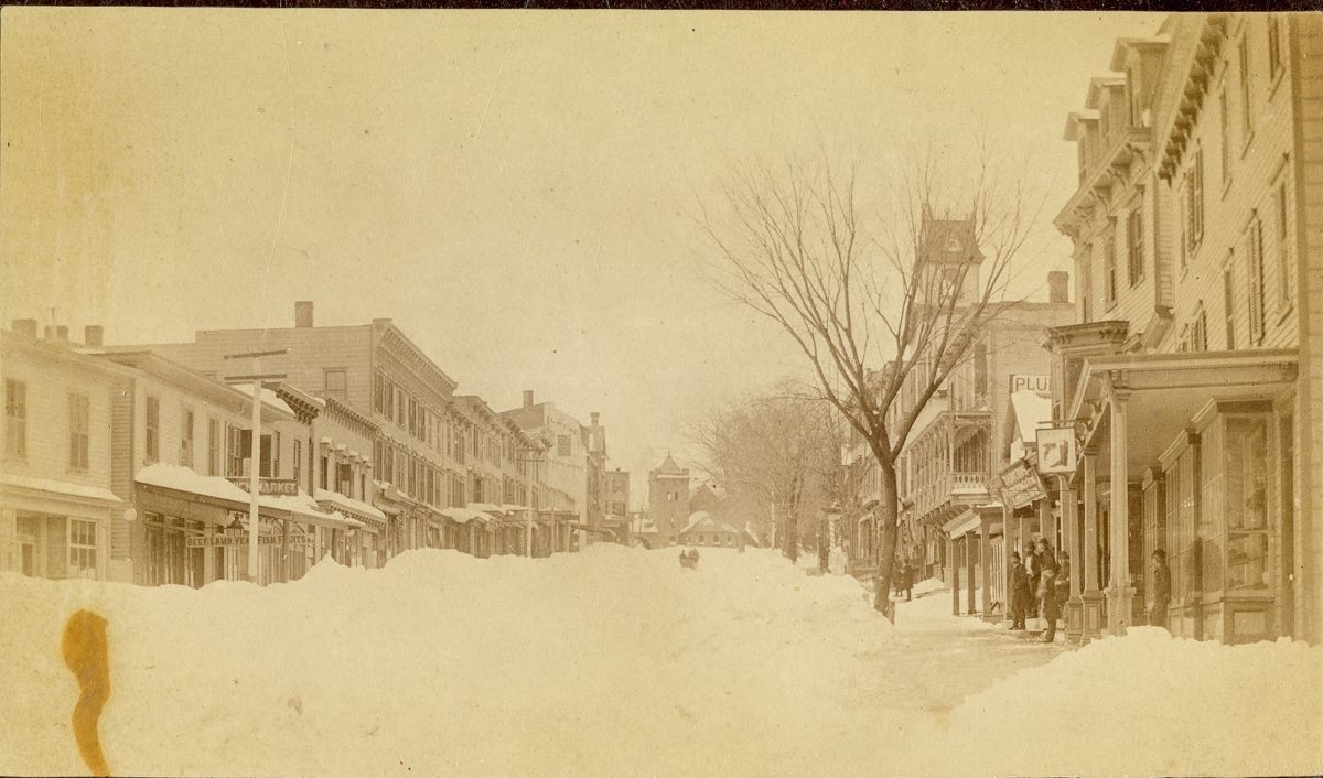 Looking north towards the top of Greenwich Avenue during the Blizzard of 1888; a horsedrawn sleigh can be seen heading up the Avenue towards the First Presbyterian Church and a group of men are standing on the covered sidewalk in front of several stores on the right side of the image.Collection