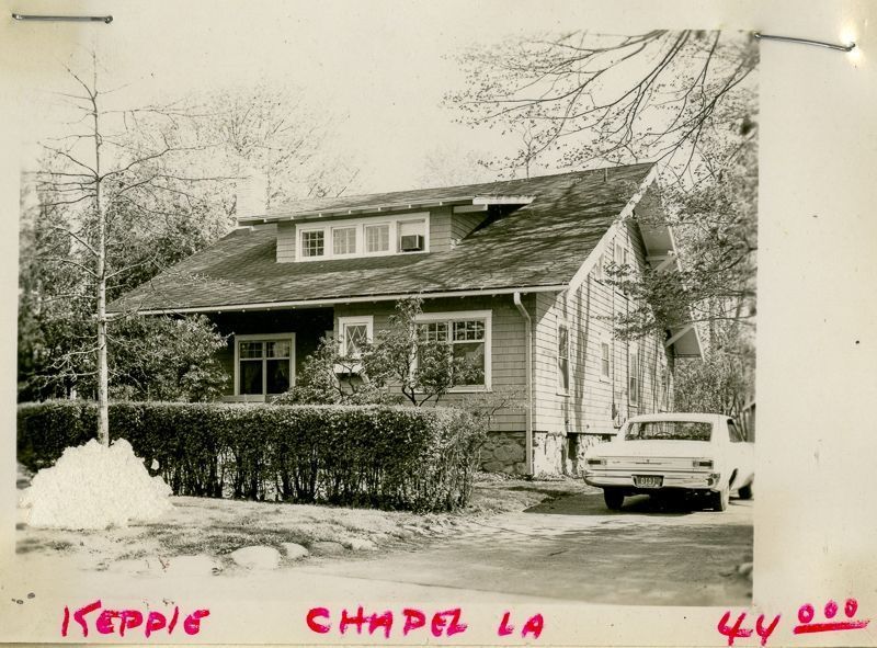 Dutch colonial-style house built circa 1926 with a car parked in its driveway, viewed from the street.Collection