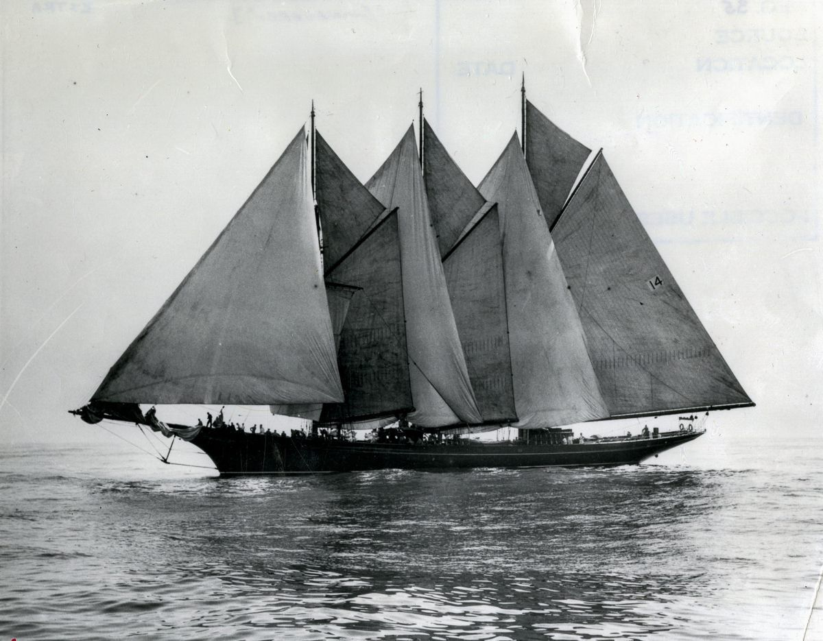 The schooner "Guinevere," owned by Edgar Palmer, sailing on Long Island Sound; a number of crew and passengers can be seen at various spots all along the boat's deck.Collection