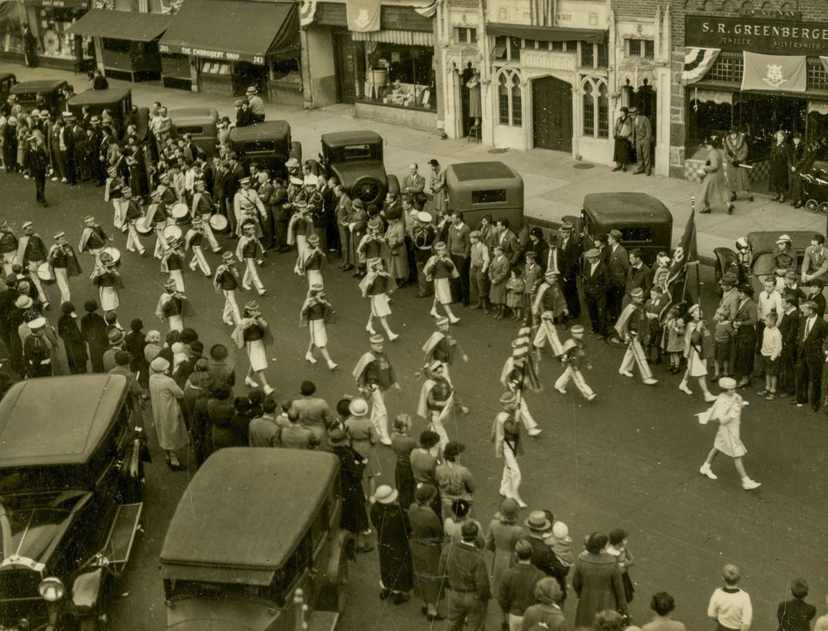A marching band in the Tercentenary Parade on Greenwich Avenue.