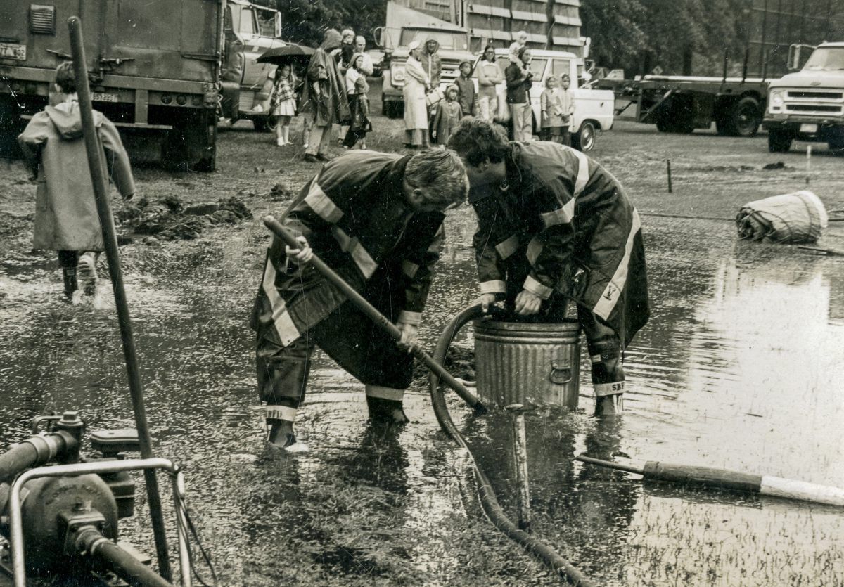 Members of the Sound Beach Fire Department work to drain floodwater from the Civic Center fields in preparation for the circus.Collection