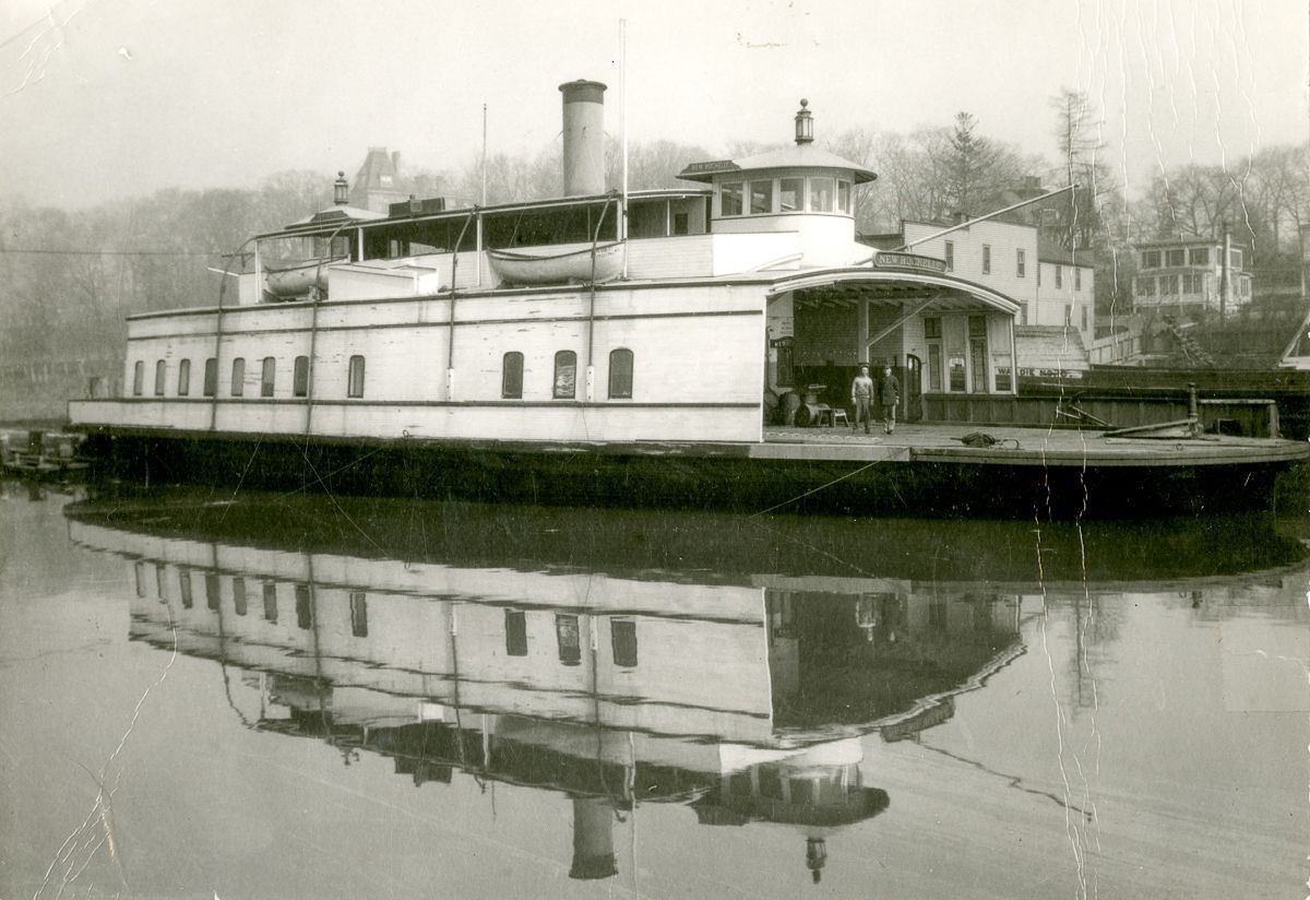 The ferry "New Rochelle" in Greenwich Harbor; two men can be seen standing on its lower deck.