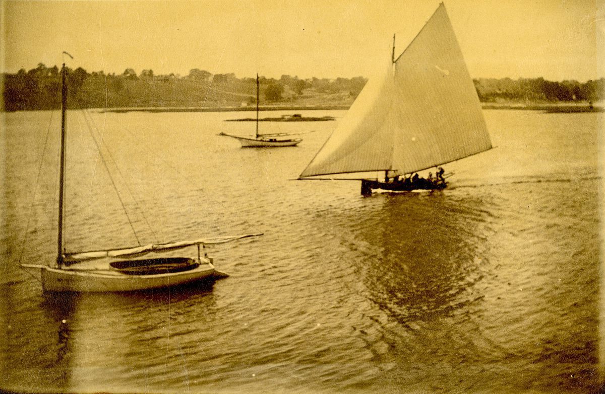 Three sailboats, including the "Sirene," in the water; two of the boats are at anchor and the third is under sail.Collection