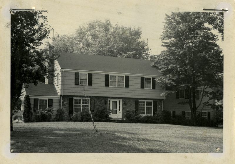 Two story house with a shingled top floor and brick ground floor viewed from its lawn.
