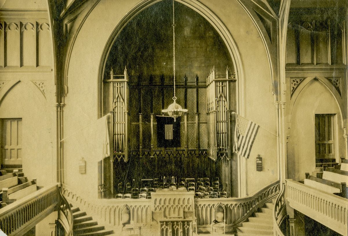 A view of the interior of Second Congregational Church, looking towards the altar.