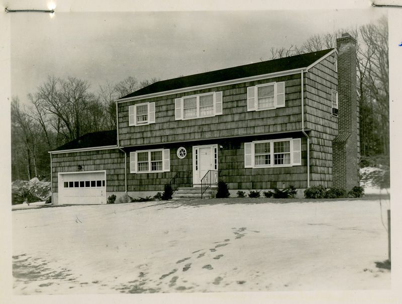 Colonial-style house built in 1962 with shingle siding and an attached garage viewed from its snow covered lawn.Collection
