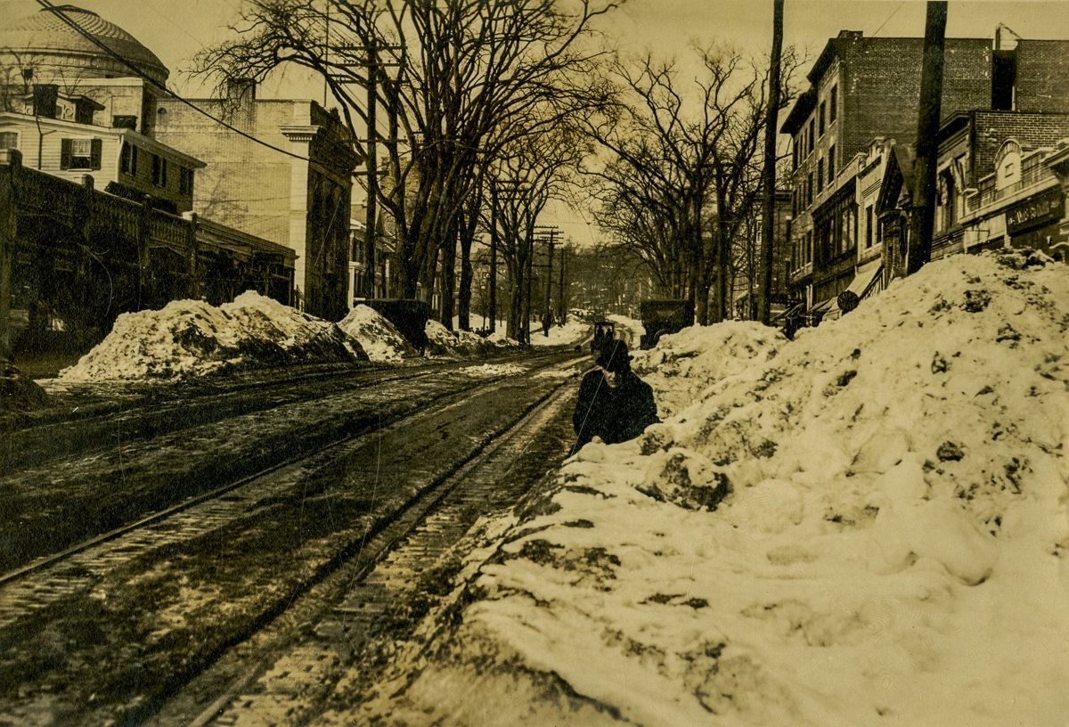 Looking north up Greenwich Avenue after a snowstorm and after the roads have been cleared of snow; a man is leaning against a snowbank in the center of the image; the Greenwich Trust Company building can be seen on the left of the image.Collection