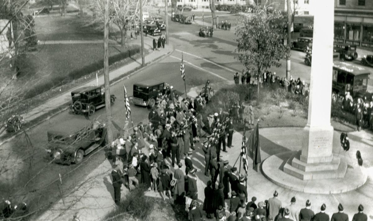 A crowd gathered for the dedication of Greenwich's World War I monument; an obelisk that stands between Greenwich Avenue and Arch Street in front of the site of a former Post Office.Collection