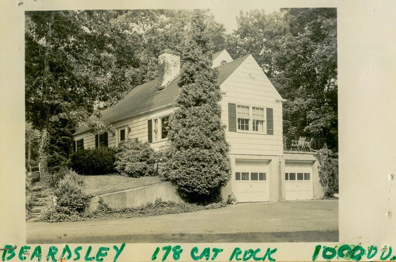 Cape house built in 1953 with a two door garage viewed from its driveway.