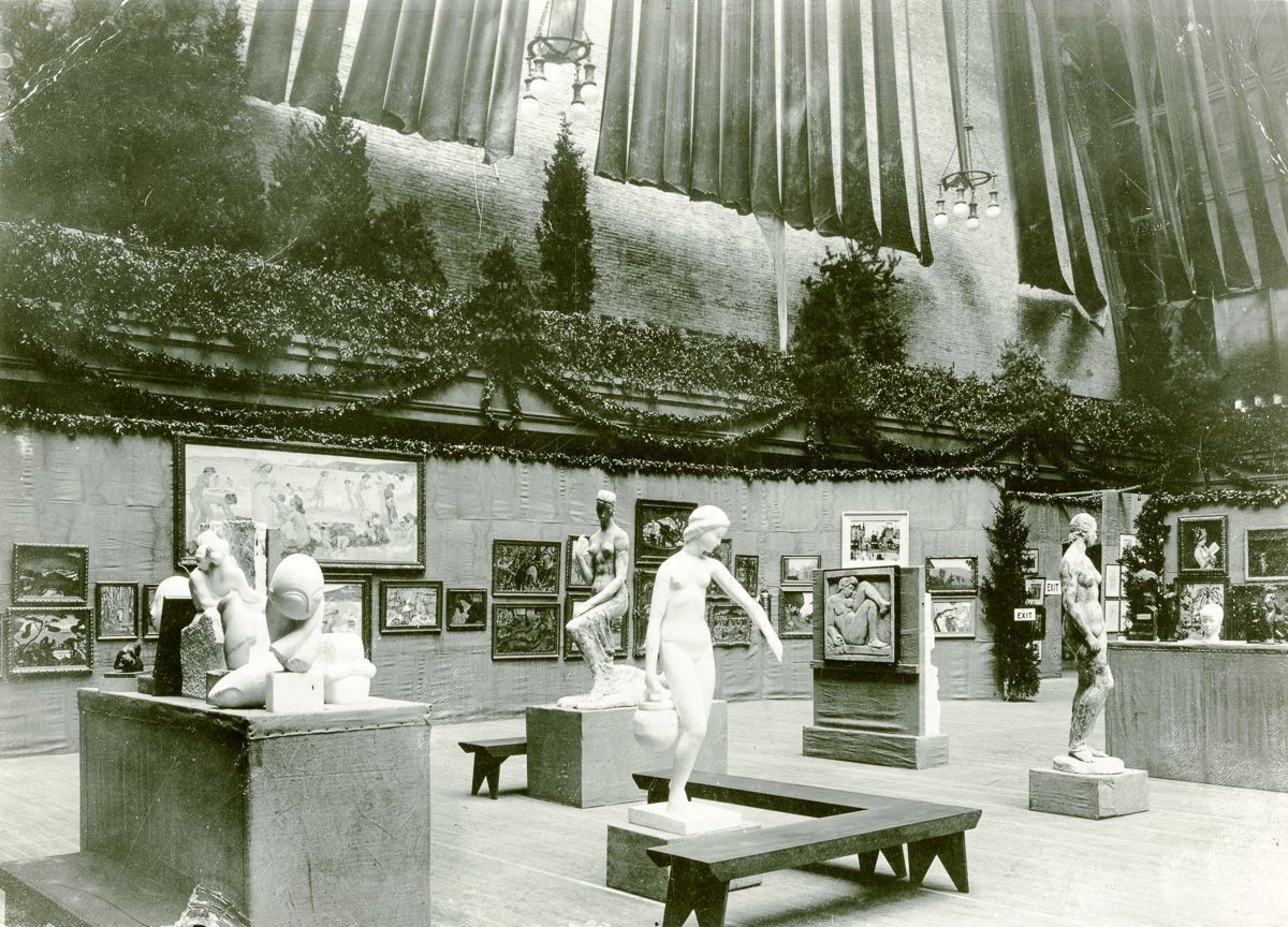 Image of a gallery in the 1913 Armory Show with a number of statues and paintings in display.Collection
