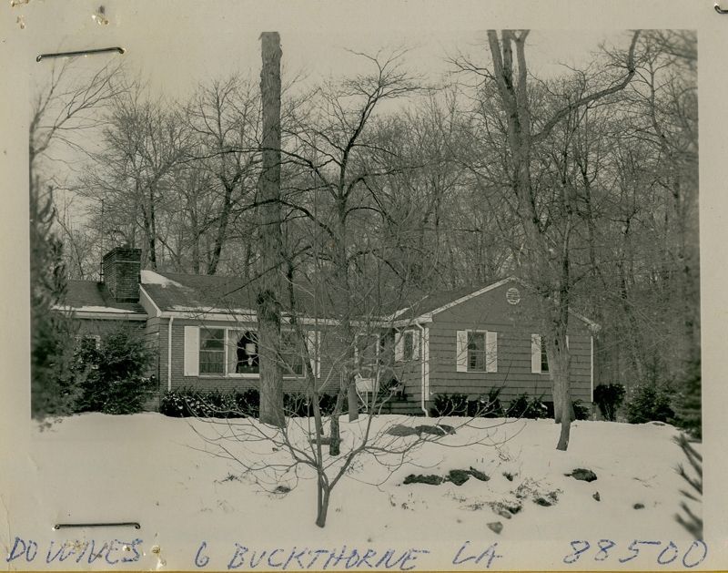 Ranch house built in 1956 viewed from its snow covered lawn.