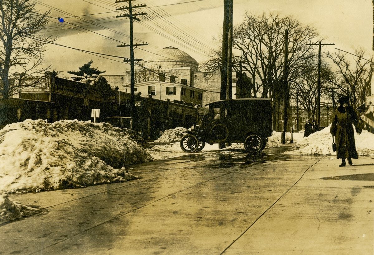 View of a number of businesses and the Greenwich Trust Company in the snow; a car is in the center of the image, parked on the sidewalk.Collection