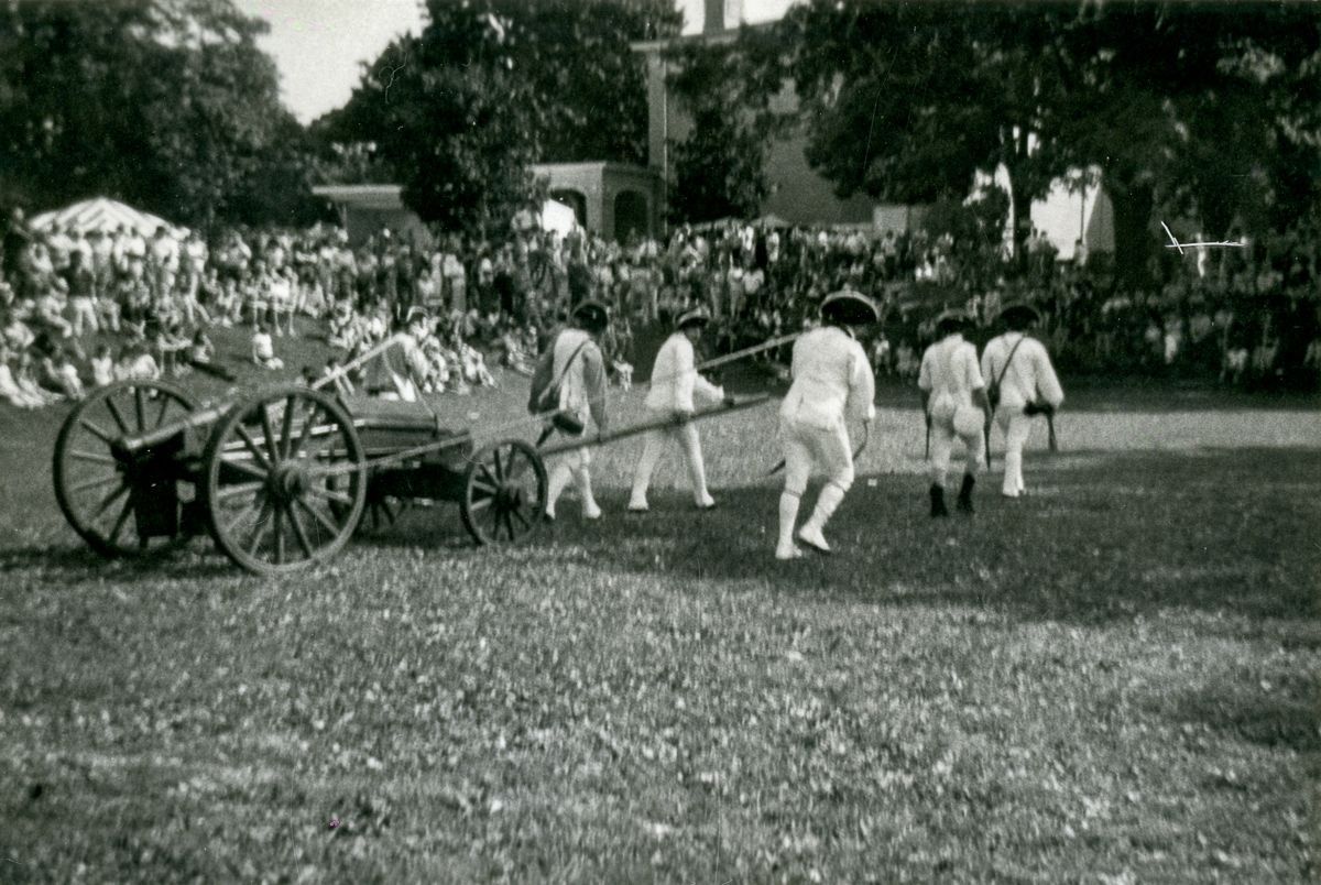 Reenactors of the Connecticut Regiment in Colonial-era uniform dragging a cannon during a Bicentennial celebration.Collection