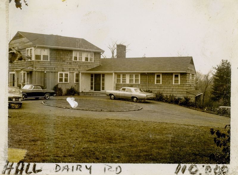 House built in 1962 with shingle and wooden siding with three cars parked in its circular driveway.Collection