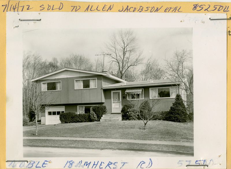 Two story house built in 1961 with a garage and low pitched roofs viewed from the street.