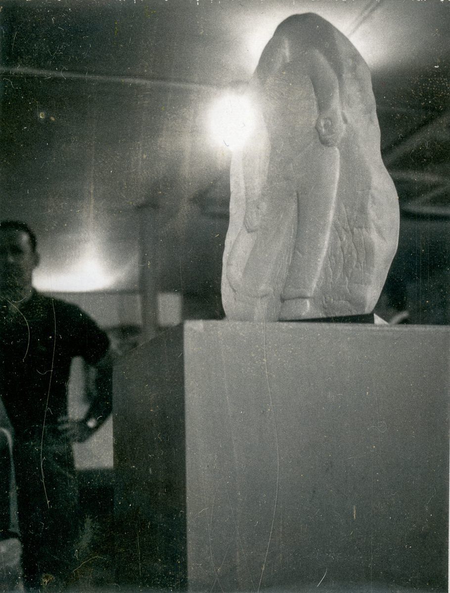 A stone sculpture with a figure carved onto its surface by sculptor Ethel Hays in an exhibition at the Greenwich Art Barn.Collection