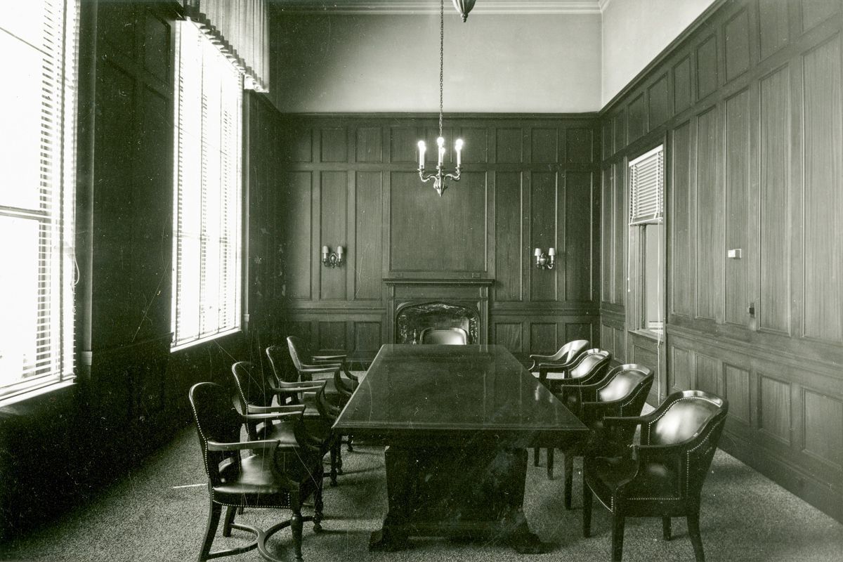 A meeting room with a long table and chairs in the Putnam Trust Company building on Greenwich Avenue.Collection