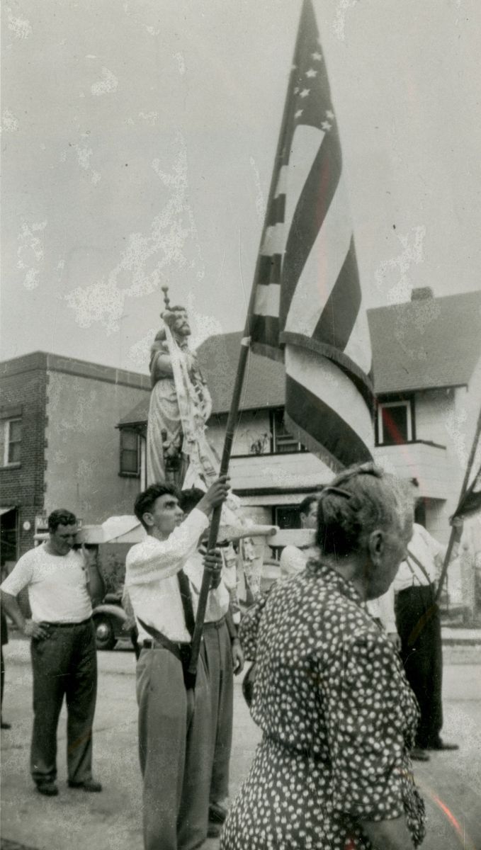 Boys carrying flags and a bier with a figure of Saint Roch or Christ in a procession celebrating Saint Roch's Feast Day.Collection