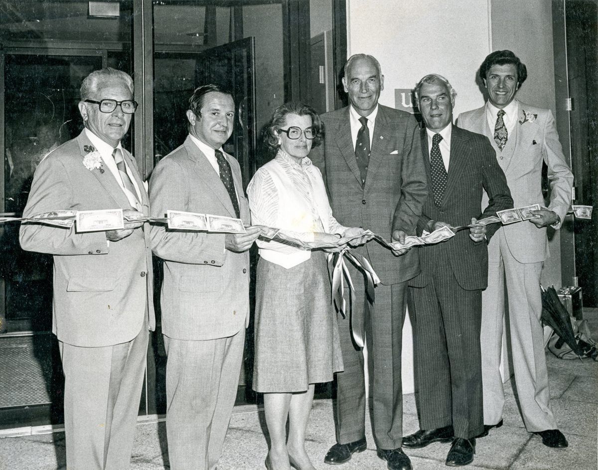 A group of people holding a connected strip of five dollar bills at the opening of the Union Trust.