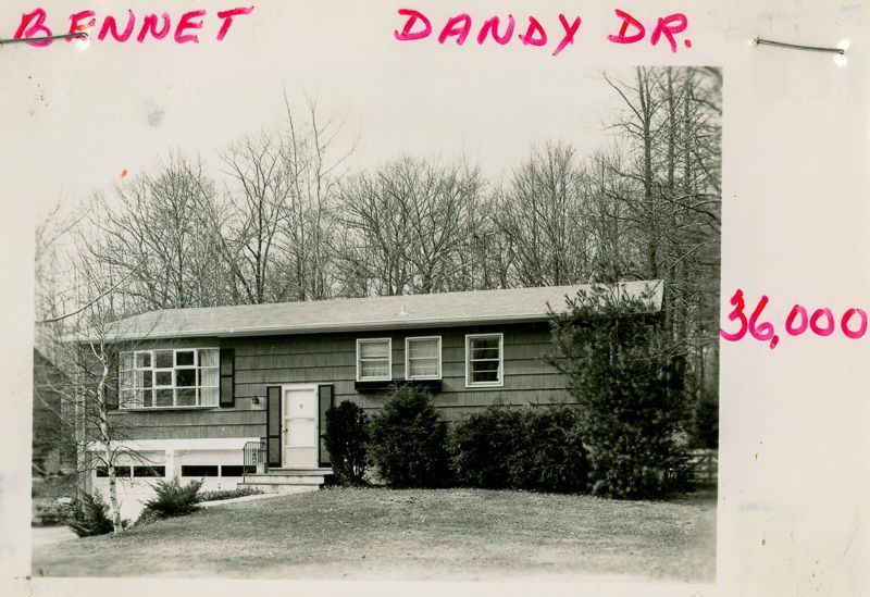 Raised ranch house built in 1956 with a two door garage viewed from its lawn.