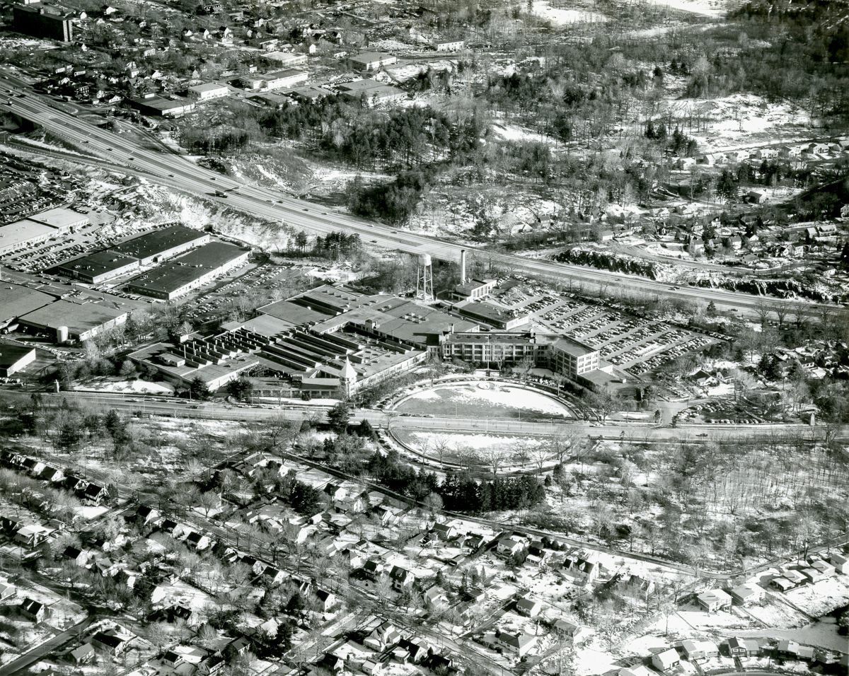 Aerial view of Cond� Nast's headquarters on the Post road with a number of buildings labeled. 1. Clairol Inc. 2. Clairol Inc. 3. Automation Engineering Laboratory (rear - Clairol-receiving) 4. Ronson Electric Shaver Division 5. Denver Chemical Mfg. Co. 6. Clairol Data Processing Center 8. Barnes Engineering Co. 9. Molykote Corp. 10. Ten Pin Bowl 11. Casa Maria Restaurant 12. Plaidland Redemption Store 13. Johnny on the SpotCollection