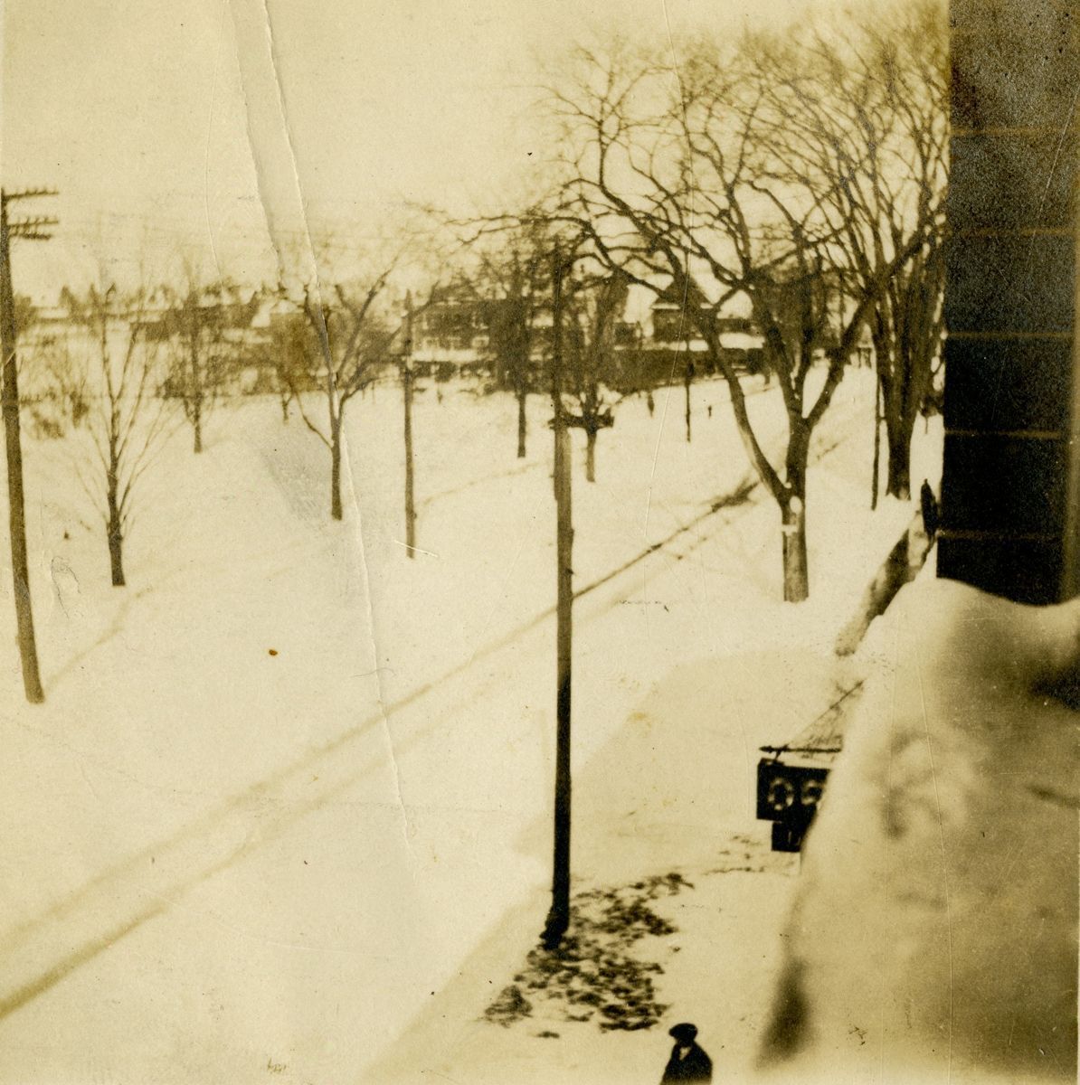 Looking up Greenwich Avenue from the window upstairs from Finch's Pharmacy during a blizzard in 1924; Havemeyer Fields can be seen, blanketed in snow, across from where the picture was taken.Collection
