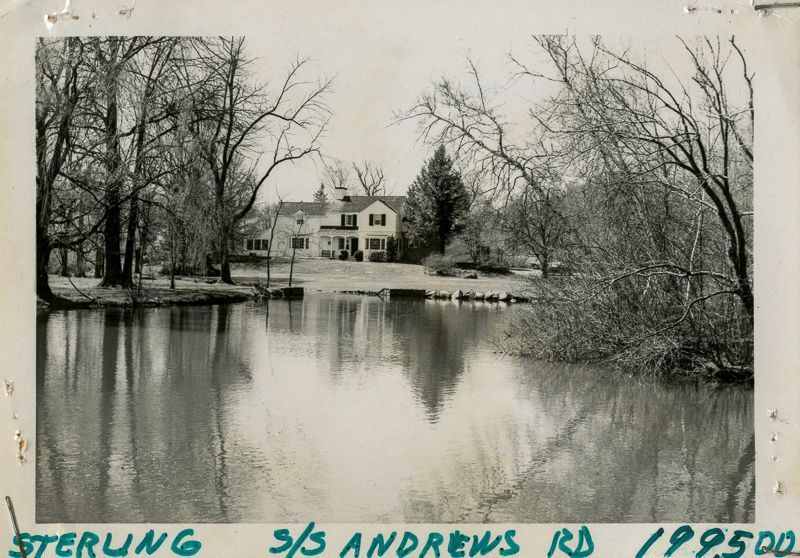Colonial style house built in 1939 viewed from across a pond on its property.