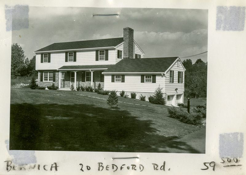 Two story house with a two door garage built in 1962 viewed from its lawn.