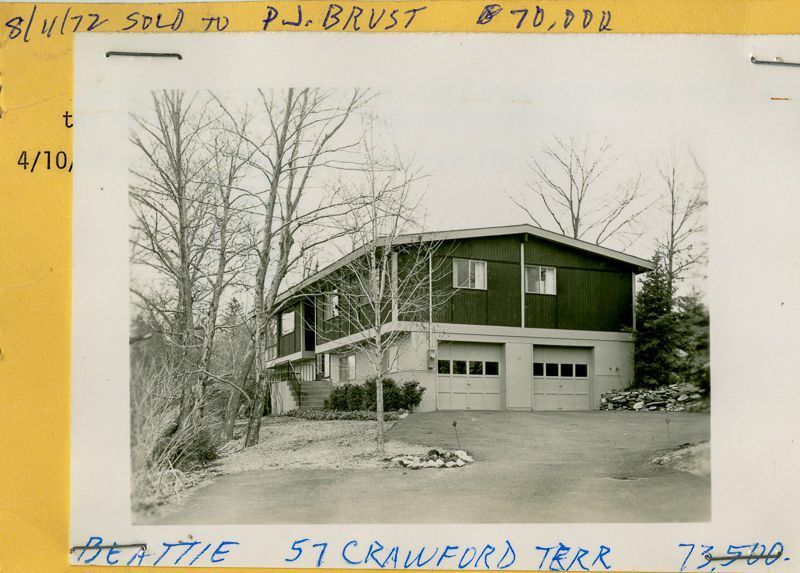 Contemporary house built in 1966 with a two door garage viewed from its driveway.
