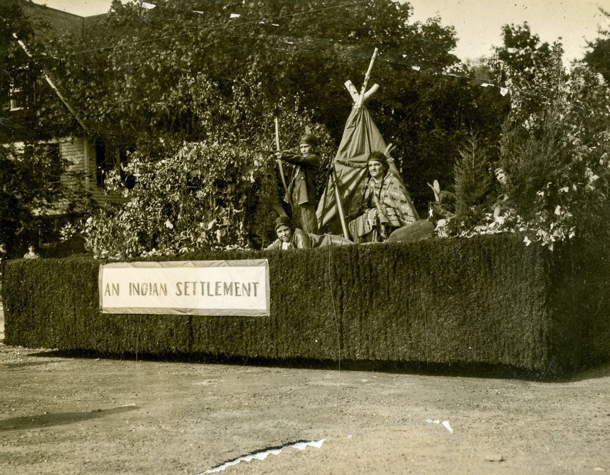A woman and children in 'redface' on a float meant to depict "an Indian settlement."