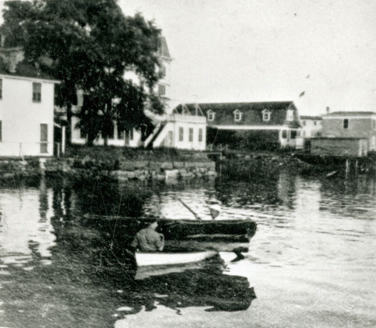 Morgan Barney and a cousin in Greenwich Harbor; Indian Harbor Yacht Club can be seen on the right of the image and the Selleck house is in the center.Collection