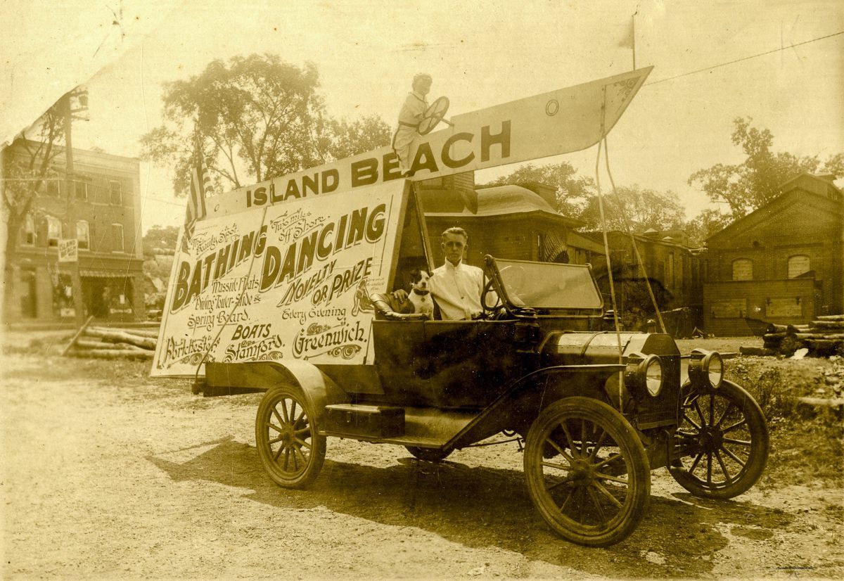 Car with an advertisement for Island Beach with a driver and his dog in the front seat.