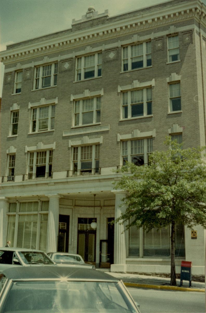 View of the Smith Building from across the street; a fallout shelter sign can be seen on the bottom right portion of the image.Collection
