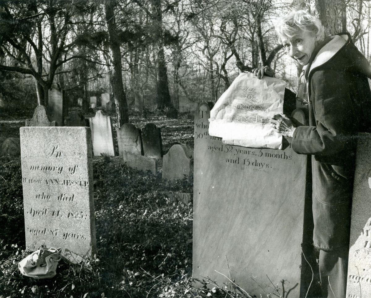 Alexandra Spann displaying a charcoal rubbing of a gravestone that she made.