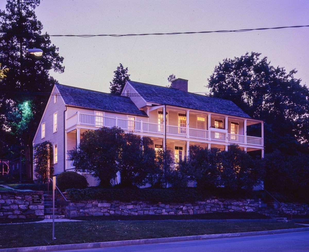 The Bush-Holley House viewed from the intersection of Strickland Road and River Road in the evening.