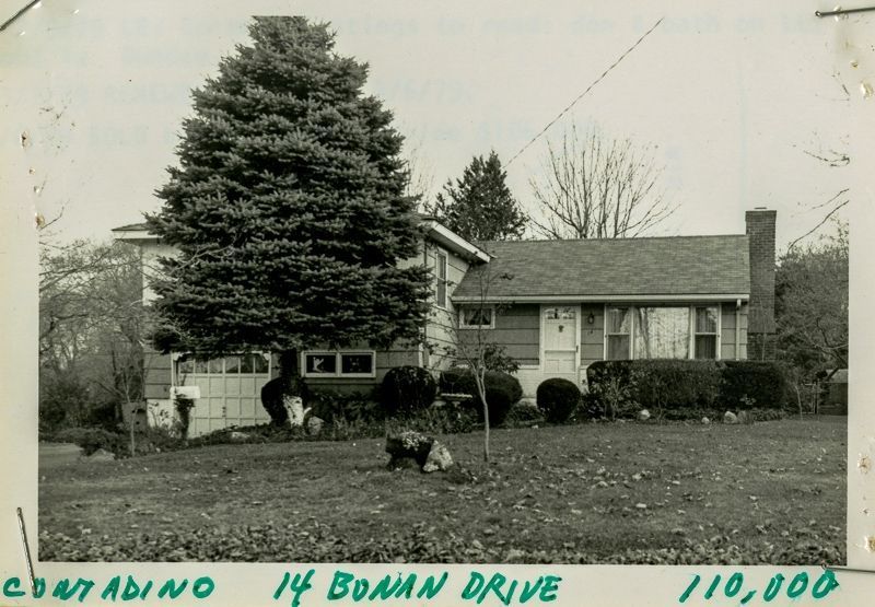 Split-level shingled house built in 1953 with a garage viewed from its lawn.
