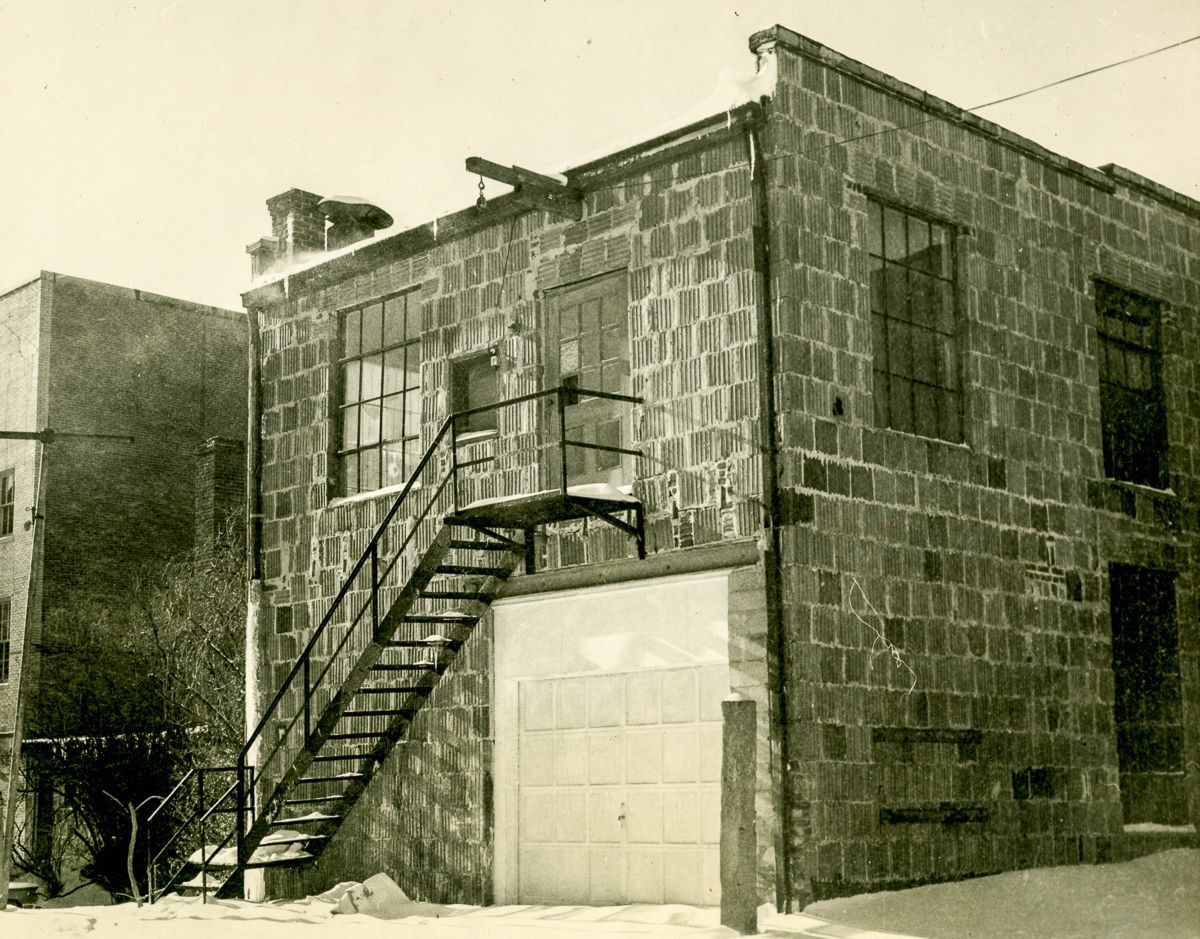 View of a two story building with a garage and stairs up to a second floor entrance. Building was being proposed to house the Greenwich Art Society's permanent art gallery on its first floor and a a studio in its top floor.Collection