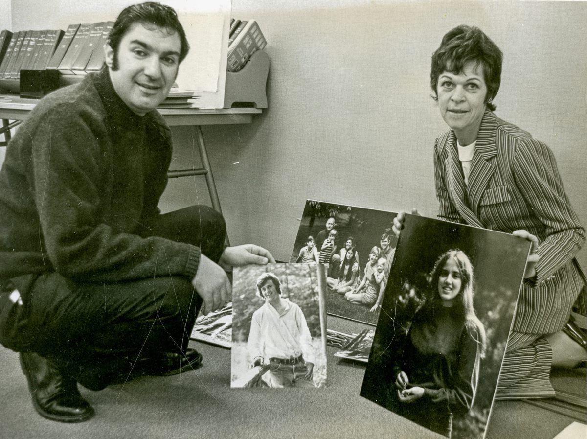 Lothar Frank and Mrs. George Boslet, Instructional Aide at Greenwich High School, posing with several of Frank's photographs that appeared in an exhibit held in the High School's Media Center.Collection