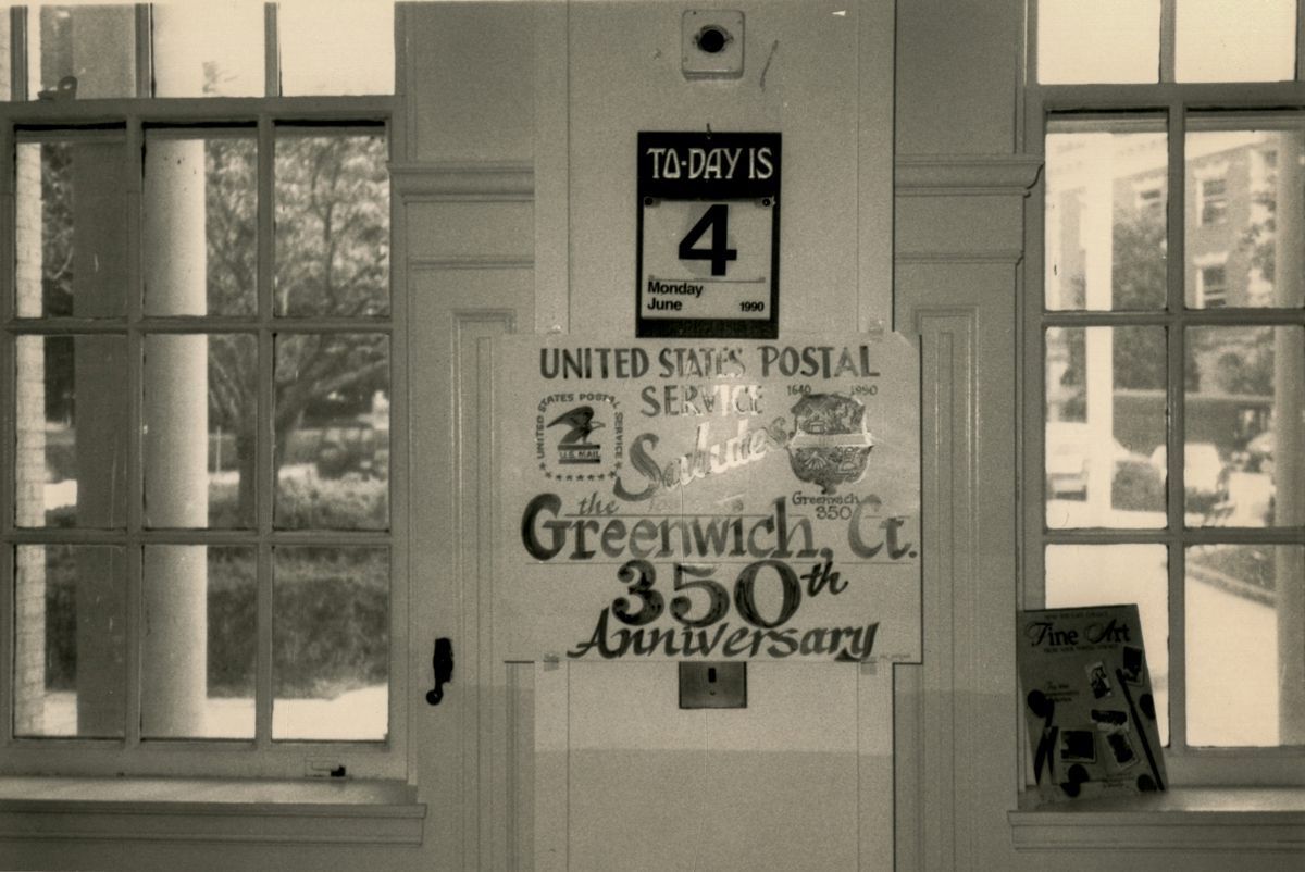 A sign in the post office that used to be on Greenwich Avenue commemorating the 350th Anniversary of Greenwich's Founding.Collection