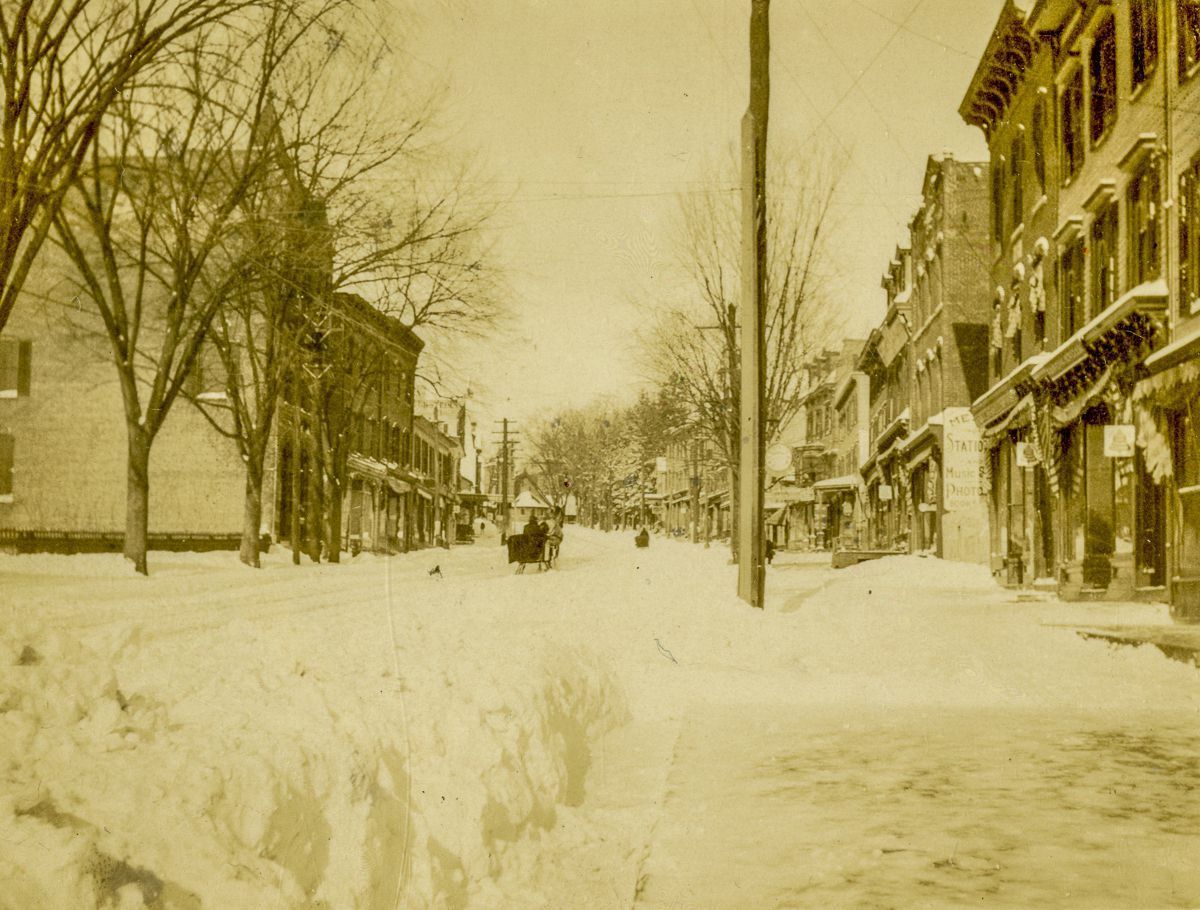 Looking up to the top of Greenwich Avenue in the winter of 1900; a horse drawn sleigh can be seen in the center of the image.Collection