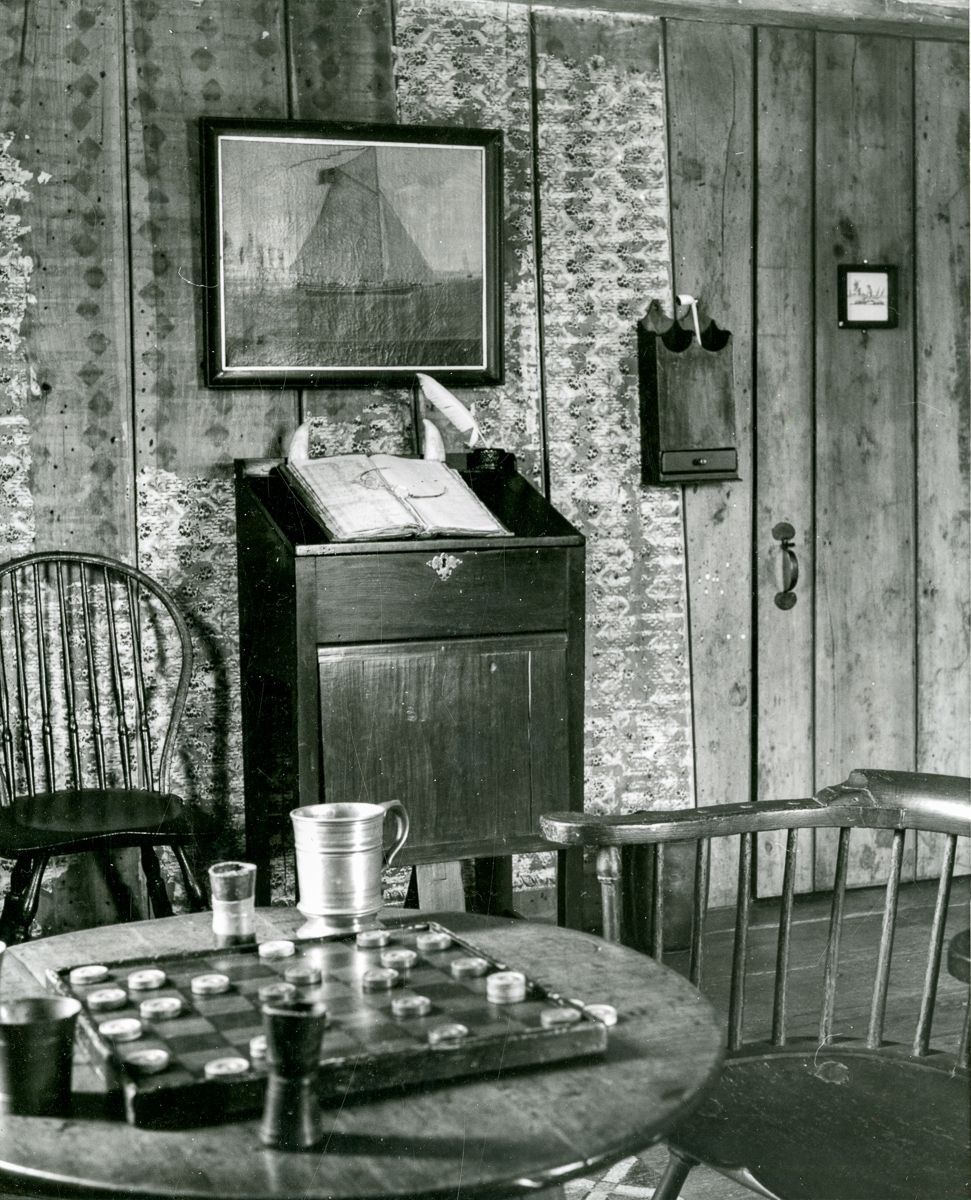 A checkers game and cups on a table in the room known as "Sarah Bush's Sickroom."