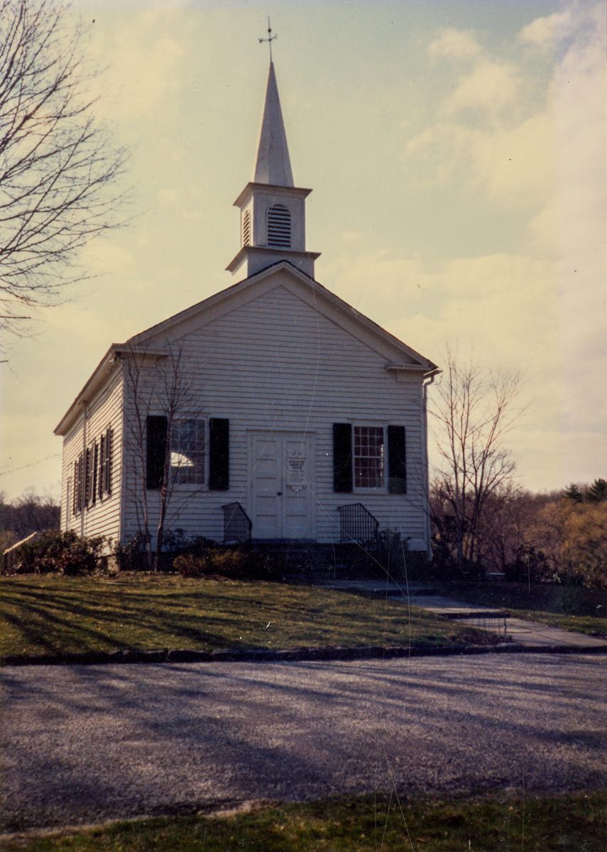 A view of the front face and south side of Dingletown Community Church and its steeple.