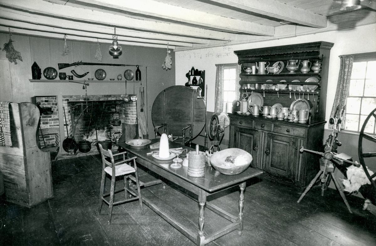 The colonial kitchen of the Bush-Holley House; a dining hutch filled with pewter objects stands against the far wall with spinning wheels on either side of it. The fireplace is set up with cooking implements and a gun hanging over it along two lanterns.Collection