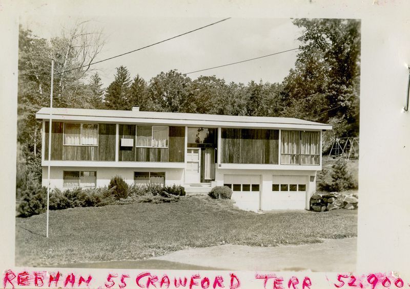 Contemporary raised ranch house built in 1963 with a two door garage viewed from the street.